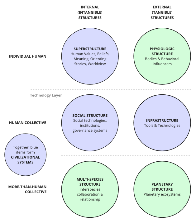 - Cultivating cultural narratives, values, and practices (superstructure) that celebrate the interconnectedness of all life and inspire a sense of shared responsibility for the well-being of the whole.